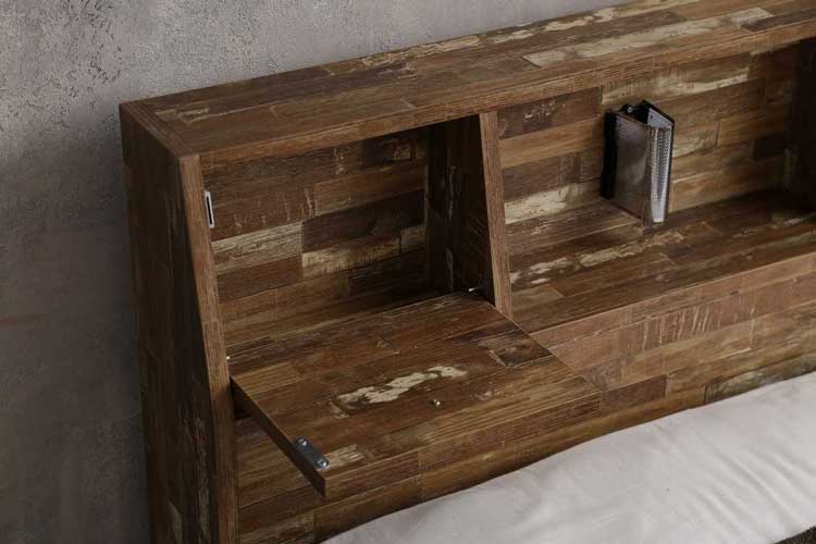 ヘッドボードのサイドには、ミニテーブルにもなるフラップ扉付き、本やマグカップなどを置いていただけます。