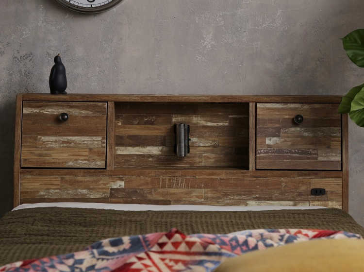BE-3111 ヴィンテージ風・寄木柄ダブルベッド(電源コンセント・照明付き)