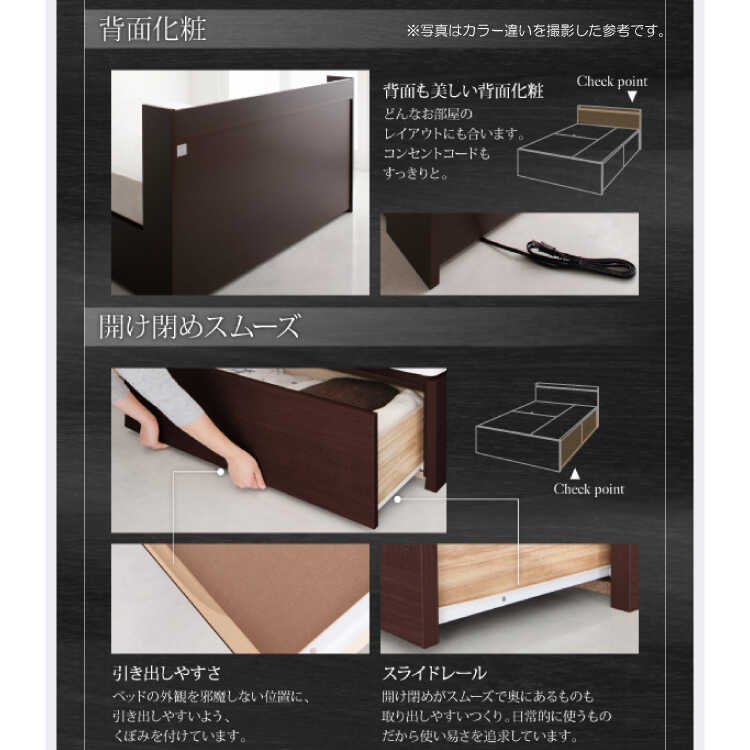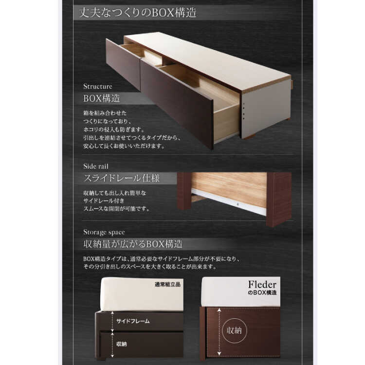 ベッド下には衣類やバッグ・毎日使う下着などを入れるのに便利な引き出し2杯をご用意。引き出しは重い物を入れた状態でもスムーズに開閉できるスライドレールを採用しています。また、引き出しの反対側はラグやスーツケースなど使用頻度が少ない大物を収納するのに便利です。