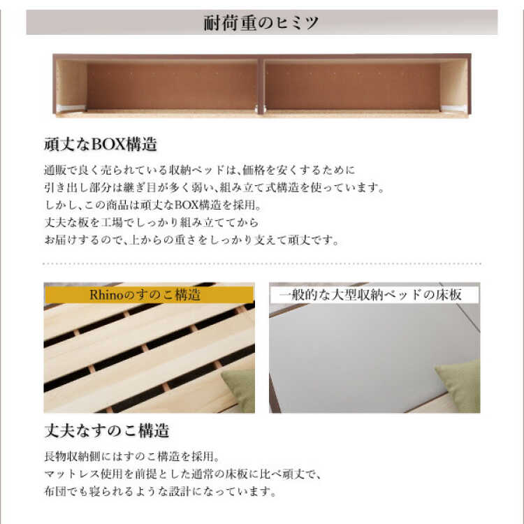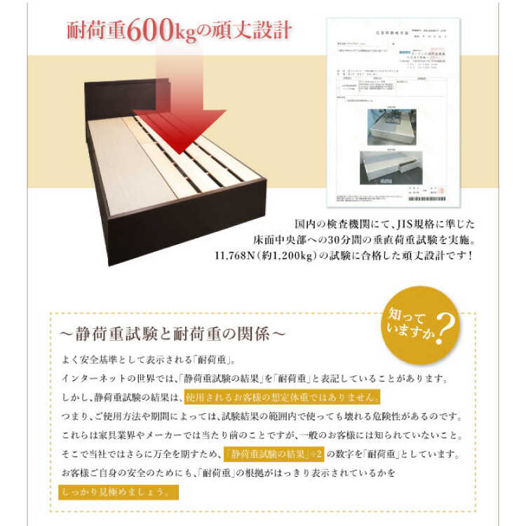 耐荷重約600kgと頑丈設計のダブルベッド。工場で組立てられた引き出しやすのこを使用した堅牢なつくりなので、マットレスだけでなくお持ちの敷き布団もお使いいただけます。さらに安心の日本製も魅力的。大正13年に創業された有名メーカーが製造しているため、質が高く長くご愛用いただけます。