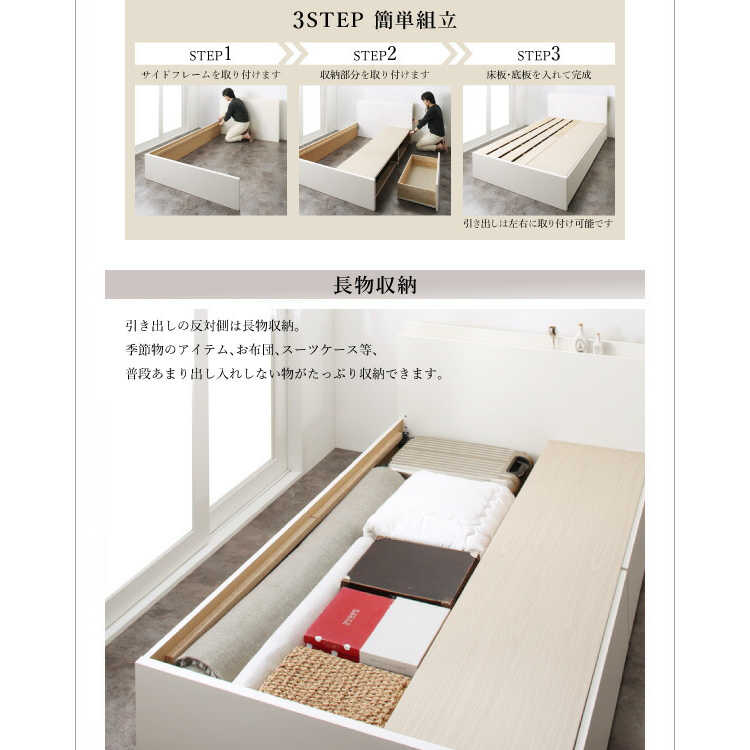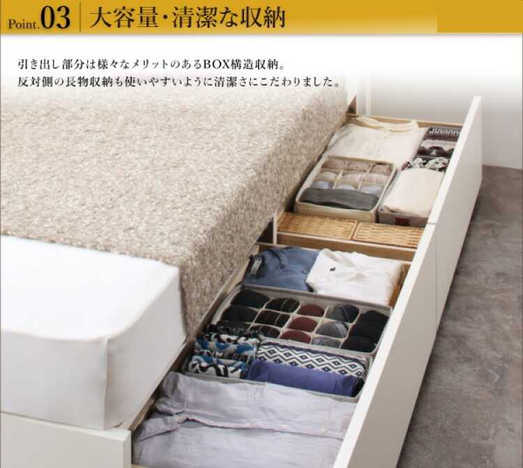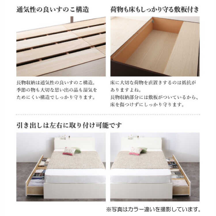 ベッド下には衣類や下着がたっぷり入る引き出し2杯と、スーツケースやラグなどの大物を収納できるスペースを設けています。引き出しは中に物を入れてもスムーズに開閉できるスライドレールを採用。左右どちらでも入れ替えられるので模様替えや引越しをして間取りが変わっても安心です。大物が収納できるスペースは上板にすのこを使用しており、大切な物も湿気がたけにくい構造でしっかり守ります。