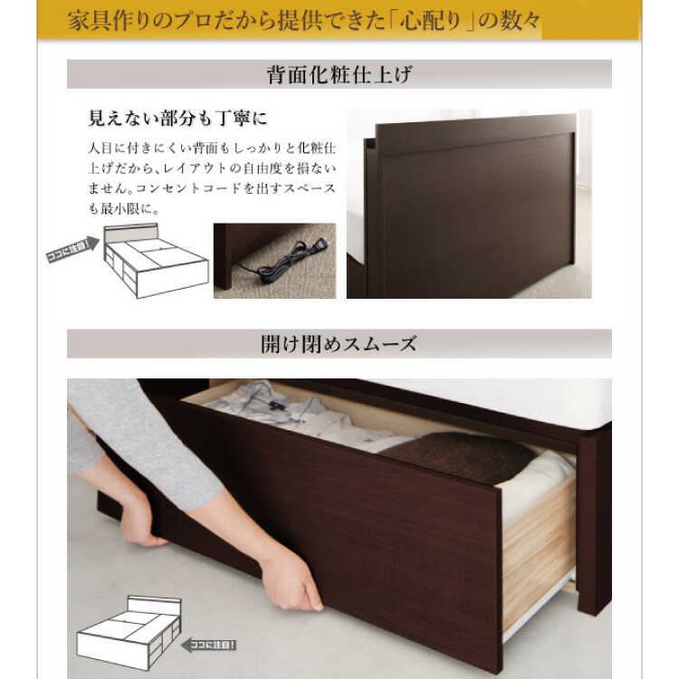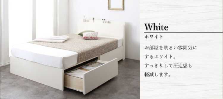 布団が使える頑丈設計のダブルベッド。引き出しはBOX構造、すのこは耐久性に優れたつくりになっているのでお持ちの敷き布団でも安心してお使いいただけます。さらに長く使っていただけるようこだわりの国内製造も魅力のひとつ。大正13年創業の老舗メーカーによって製造・組立られてるため、品質の高さは間違いなく、安心してご使用できます。カラーはお部屋の雰囲気がパッと明るくなる白ホワイト。無駄な装飾が一切ないシンプルなデザインなので、お部屋のテイストが変わっても長く使いやすいです。