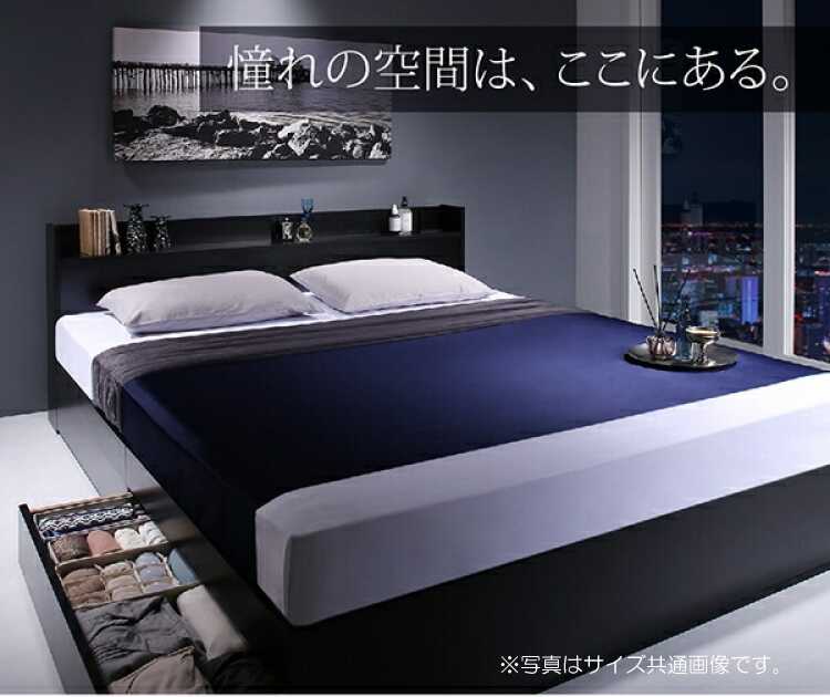 高級ホテルのようなラグジュアリーな空間を演出する、スタイリッシュな黒ブラックのダブルベッド。装飾が一切ないシンプルなデザインで、お部屋をかっこよく見せてくれます。ヘッドボードにはコンセント付きの宮棚、床下には衣類がたっぷり入る引き出し収納を設けており、機能性も抜群です。