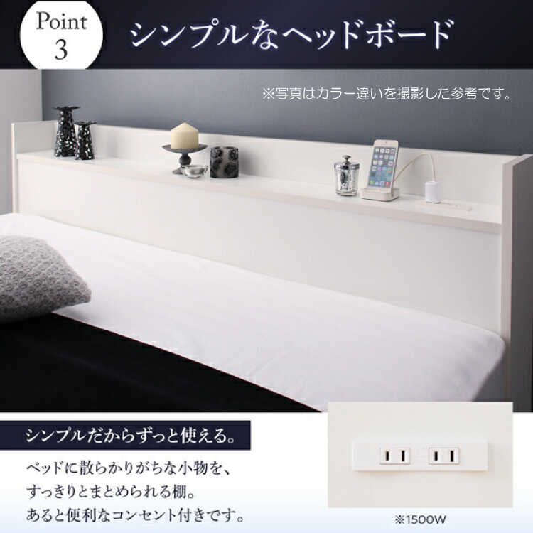 スッキリとしたヘッドボードには、お気に入りの小物や目覚まし時計が置けるよう宮棚をご用意しています。棚部分には側板、背板があるので横や後ろに小物が落下しにくく安心です。さらに、片側には電源コンセントを設けているので、就寝中にスマホやゲーム機の充電ができます。コンセントは2口あるので夫婦で使用する際も喧嘩になりません。