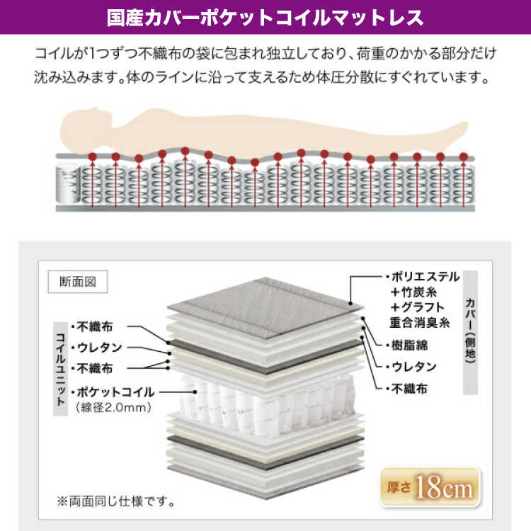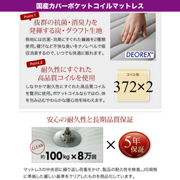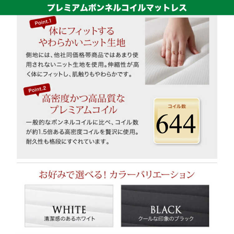 一般的なボンネルコイルに比べてコイル数が約1.5倍ある高密度コイルを使用。耐久性が格段に優れています。防ダニ・抗菌・防臭加工が施されたニット生地を使用しています。