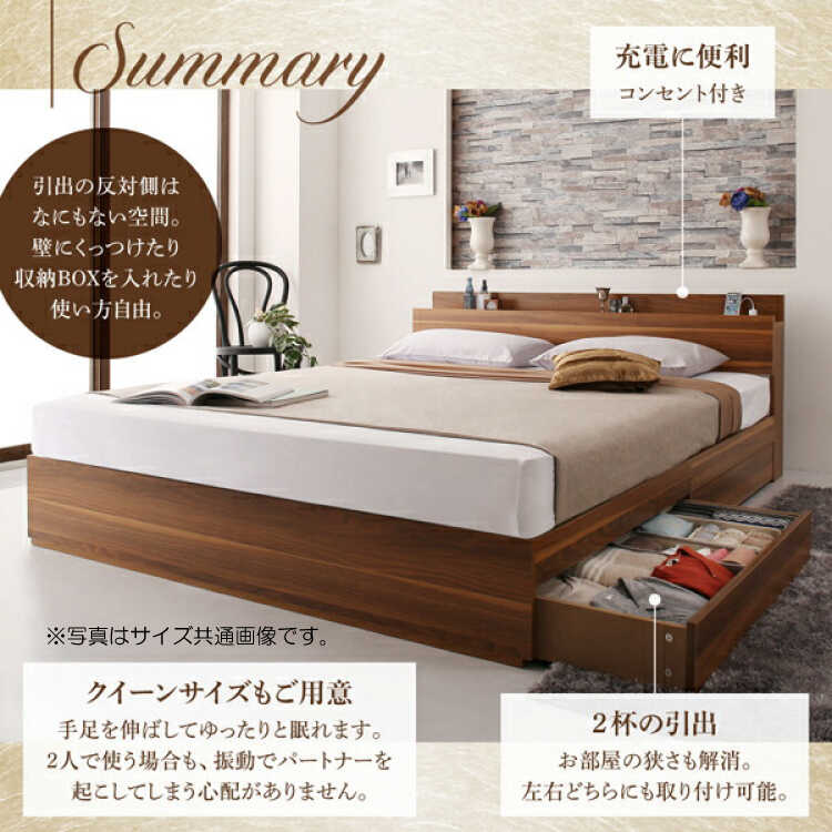 引き出し2杯付き(左右入れ替え可能)注意事項 ※写真はサイズ共通画像です。本ページはクイーンベッドの販売です。小物等は付属しません。