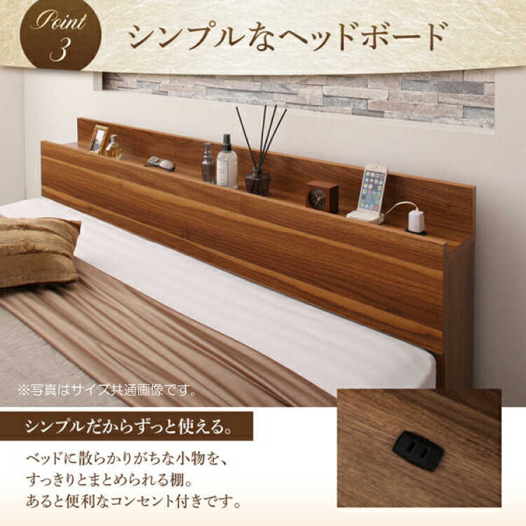 ヘッドボードにはメガネや目覚まし時計が置ける奥行き14cmの宮棚付き。宮棚前後に高さを出すことで、置いた小物が落下しにくい設計になっています。さらに、お気に入りの雑誌や本を立て掛けることができて、ちょっとしたディスプレイスペースとしても活躍します。また、サイドには1口コンセントを設けているため、就寝中にスマートフォンの充電が可能です。