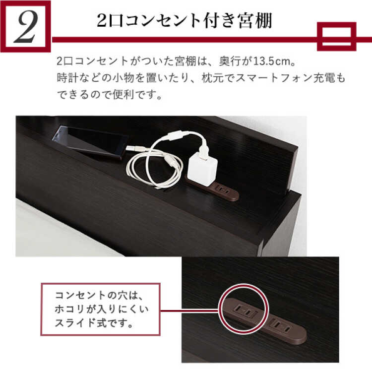 頭上にスマホや時計が置ける宮棚を設けました。奥行13.5cmとしっかり広さがあるので、お気に入りの雑貨を飾るなどインテリアを楽しめます。また、スマホの充電や照明の使用に便利な2口コンセントが設けられています。枕元にあるのでスマホのアラーム機能も使用しやすく朝がスムーズです。コンセントの穴はホコリが入りにくい安全仕様のスライド式を採用しました。