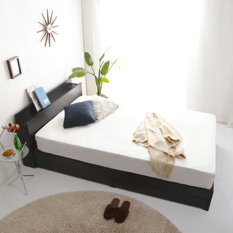 抗菌&防臭機能付きのブラックオーク調ダブルベッドは、美しさにこだわってベッドや引き出し内部にも木目調プリント紙を使用しています。標準的なマットレスを敷いても程よい高さで腰を掛けやすく、ソファ代わりにもおすすめ。別ページで同シリーズのサイズ・色違いを展開していますので、是非合わせてご覧ください。(※本ページはダブル・ブラックオーク調の販売です。)