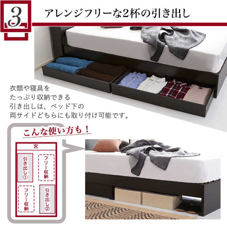 ベッド下は衣類や寝具をたっぷり収納できる引き出しを2杯設けました。引き出し内は仕切りがないので大きいものから小さいものまでひとまとめに収納でき、生活感を隠してくれます。また、間取りに合わせて柔軟にレイアウトできるよう両サイドどちらでも取り付け可能です。フリー収納と引き出しを左右に組み合わせるなど自由な配置をお楽しみください。