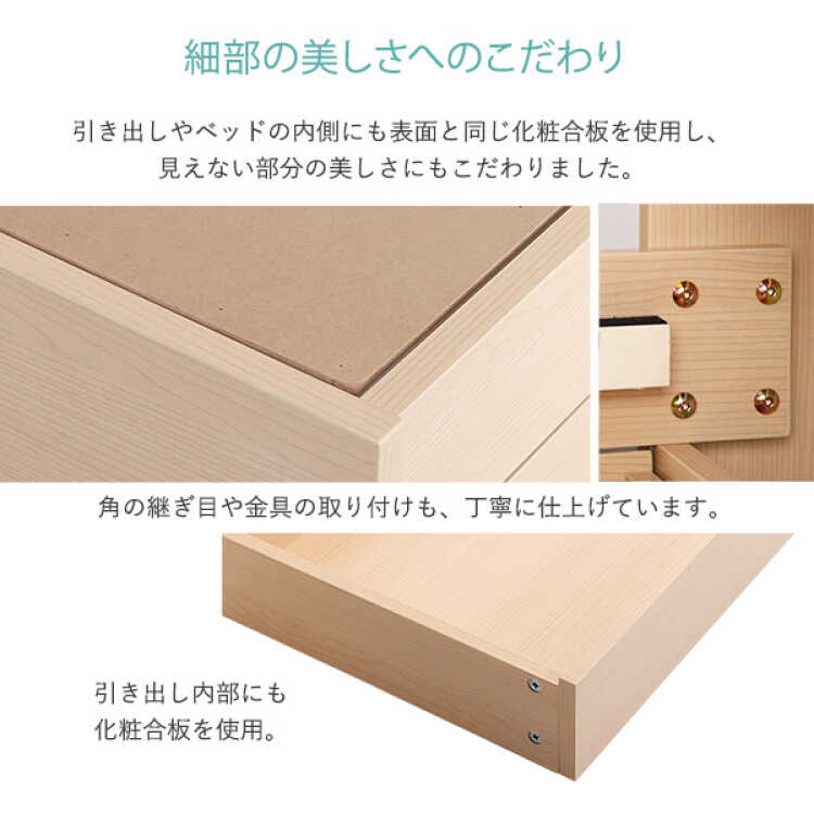 床から床板までの高さは26cm。一般的なマットレスを敷いても低すぎず高すぎないので、日中はソファ感覚で腰掛けることができます。表面は木目柄が美しい化粧合板を採用。引出しの内部やベッドの内側と細やかな部分までプリント紙が施されており、見えない場所にもこだわりを感じさせます。飽きが来にくいシンプルなデザインなので、お子様から大人まで幅広くお使いいただけます。