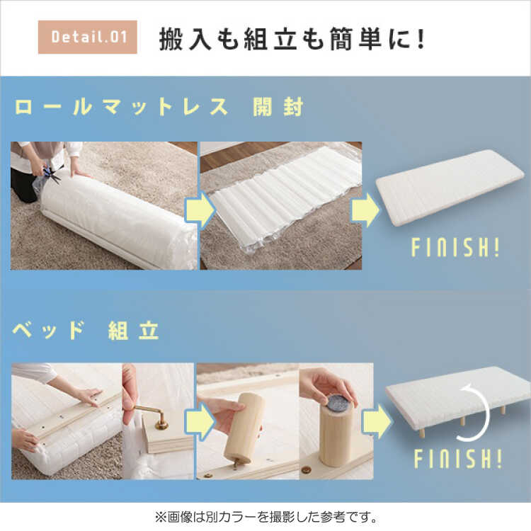マットレスは厚さ10cmの高反発ウレタンを使用しているため、底つき感がなく快適な睡眠環境をサポートします。沈み込みが少ないタイプなので身体に均等に圧力がかかり、寝返りも楽にできます。さらに、強い反発力があるため、長時間座ってもへたりにくく長くご愛用いただけます。マットレスの表面は肌触りの良いメッシュ生地で通気性も抜群。夏の暑い時期やジメジメした季節も快適です。マットレスはコンパクトな圧縮ロール梱包でのお届けですので、お部屋までスムーズに搬入できます。
