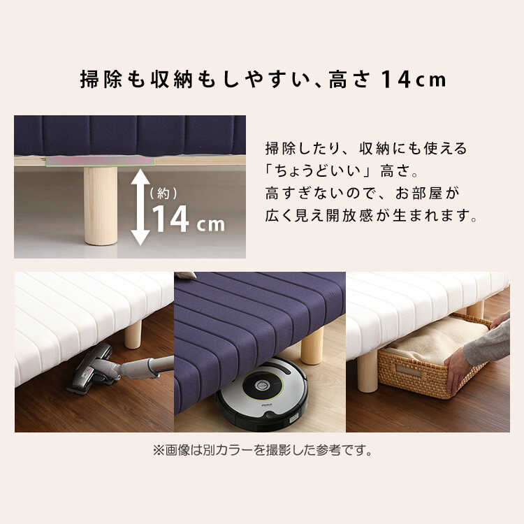 脚は丈夫な天然木パイン材を採用。12本の脚でベッド本体をしっかり支えているため安定感があります。耐荷重はなんと180kgと頑丈設計で、大人2人でも安心して使用することができます。また、脚の高さは14cmあるのでベッド下にお掃除ロボットも通りやすく、常に綺麗な状態をキープすることができます。