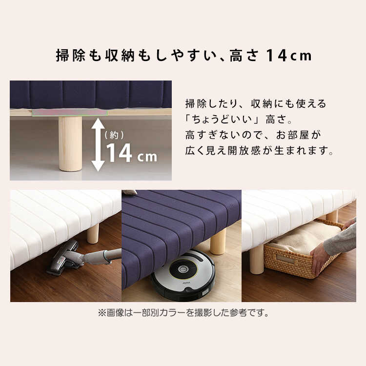 脚は爽やかなナチュラル色のパイン材を採用。12本の脚でしっかり支えているので安定感があります。耐荷重は約180kgと大人2人が安心して使える頑丈設計。脚裏にはフローリングがキズつきにくいようフェルトが付属します。また、脚の高さは14cmと掃除したり収納にも使える丁度良い高さ。ベッド下にお掃除ロボットも通りやすく、常に綺麗な状態を維持することができます。