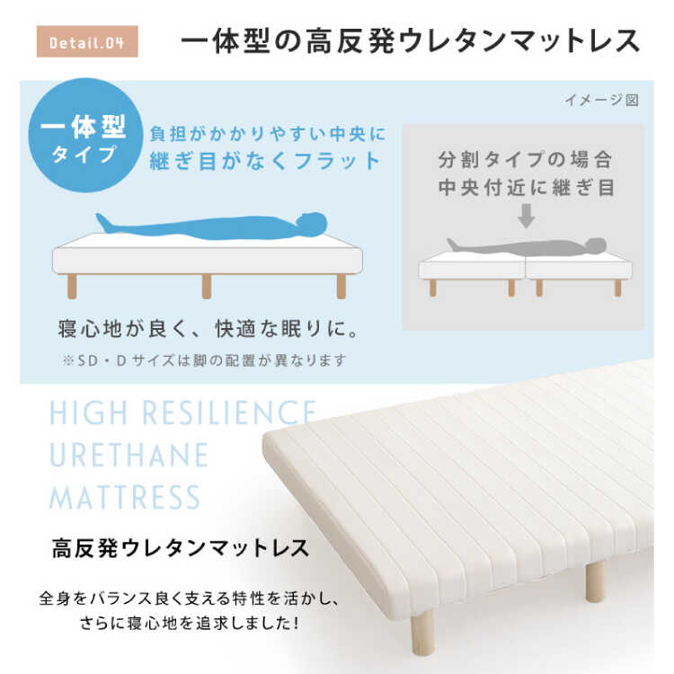 マットレスは分割タイプではなく一体型なので継ぎ目がなくフラットで快適。マットレスは高反発ウレタンを使用してるので全身をバランス良く支えてくれます。深く沈みこまず反発力があるので寝返りも楽にできます。さらに、硬度が高いため長期間使用してもへたりにくく耐久性にも優れています。張地は爽やかな白ホワイト。ナチュラルな木脚と相まって温かみのある優しい空間へと導いてくれます。また、マットレスはコンパクトに圧縮された状態でのお届けですので、お部屋までの搬入もスムーズに行えます。