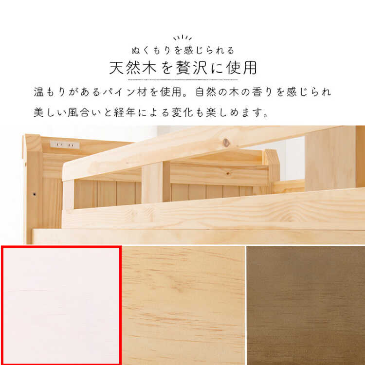 白ホワイトウォッシュ色のすのこロフトベッドは、安心してぐっすりと眠りにつけるよう寝台の周りには少し高めのフレームが配されています。