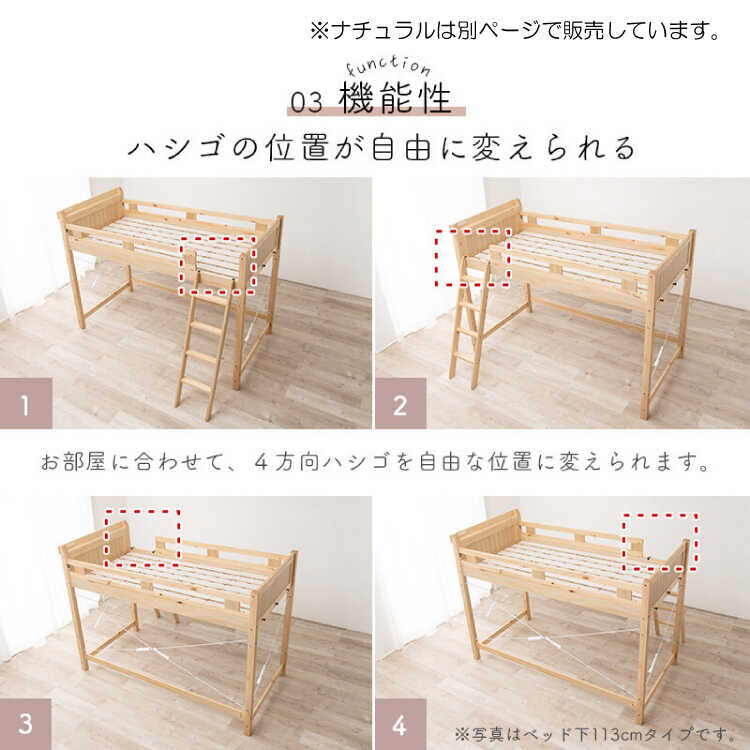 ベッド下は高さ140cmあるので、ベッドとして使用するだけでなくベッド下にデスクを置いて作業スペースにしたり、キャビネットや収納ケースを置いて収納スペースとして使用したりとお部屋を有効活用できます。