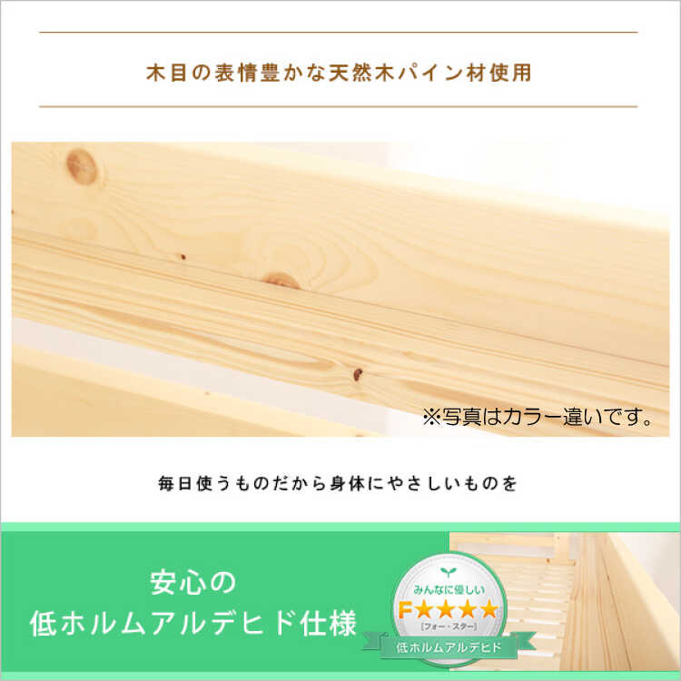 素材は木の温もりをたっぷり感じられる天然木パイン材を使用。パイン材は熱や湿気・光の吸収率が高いと言われており、心地良い木の香りを感じるフィトンチッドという物質が多く含まれているため、リラックス効果があります。さらに、使用している部材や塗料・接着材はシックハウス症候群の原因と言われているホルムアルデヒドが少ないため、お子様のいるご家庭でも安心してお使いいただけます。