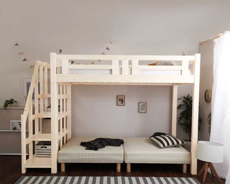 ベッドの上り下りははしごではなく安定感のある階段タイプを採用。手すりも付いているのでお子様でも安心してご利用いただけます。階段下にはお気に入りのインテリアや収納ボックスを置いたりと収納スペースとして使用できるため、物が多い方や収納が少ないお部屋にもおすすめです。