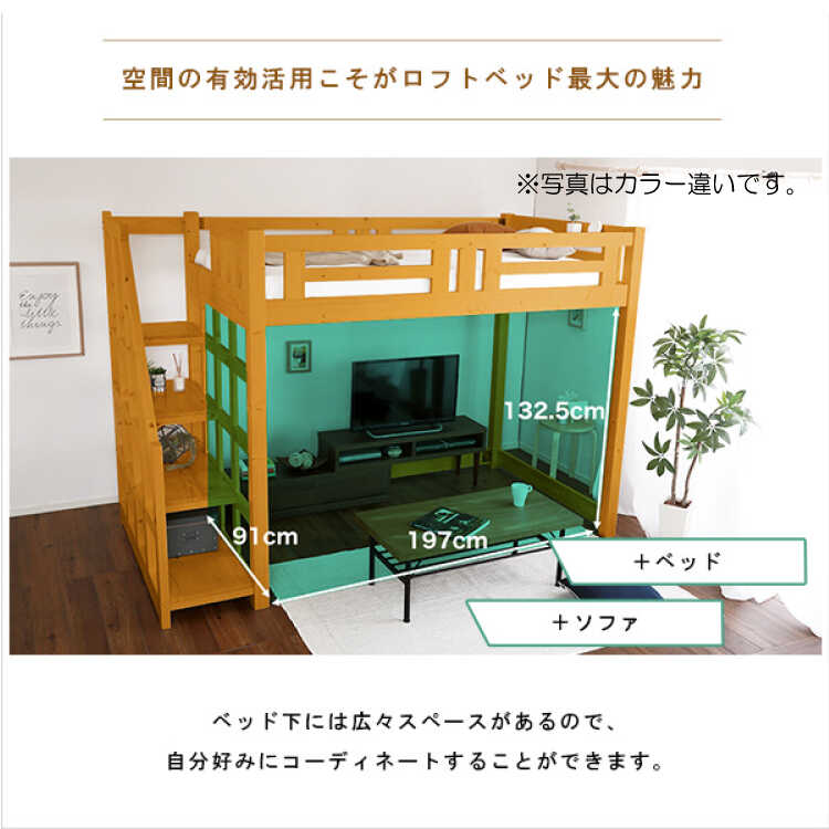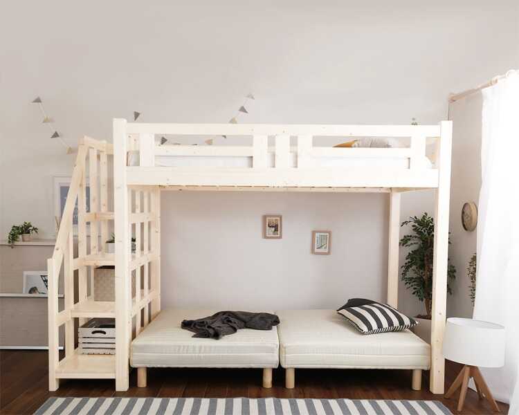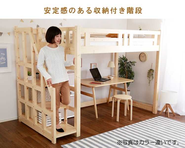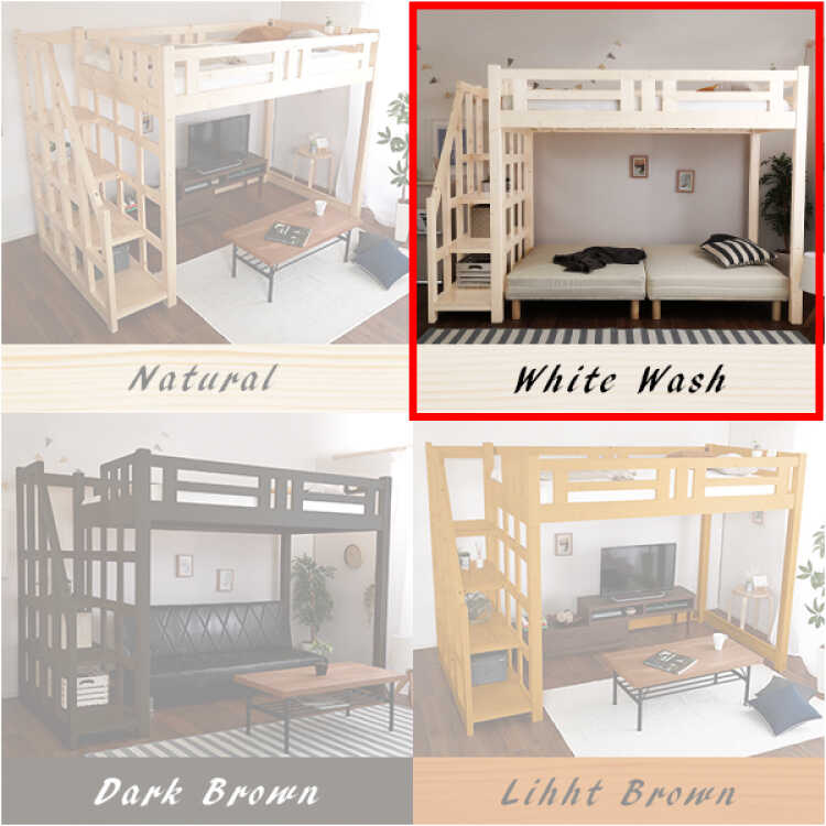 温かみのある天然木製の階段付きロフトベッド。安価なプリント化粧板ではなく、天然木をふんだんに使用しているため落ち着いた空間を演出します。カラーは木目がうっすら入った人気のホワイトウォッシュカラーで、ガーリーや北欧・ナチュラルテイストに相性抜群です。