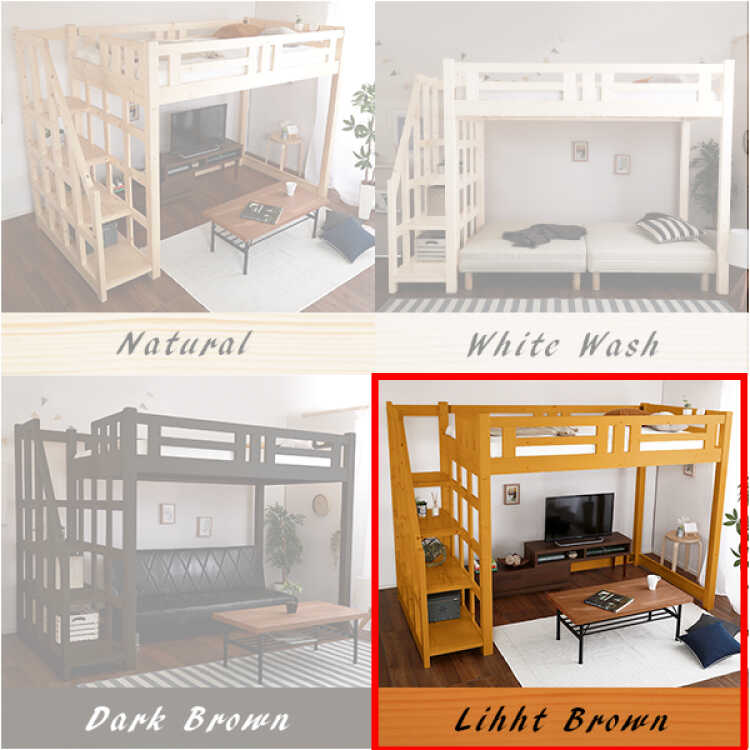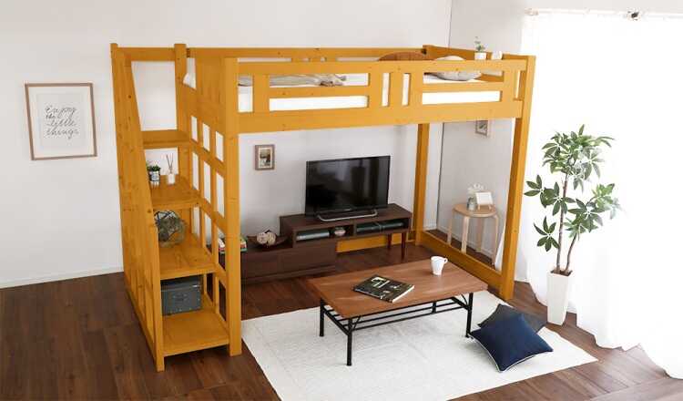 はしごではなく階段を採用しているため安全に昇降することができます。さらに手すりも付いているのでお子様でも安心。階段下には収納ボックスを置いたり、ぬいぐるみやインテリアを置いてちょっとしたディスプレイスペースとしても活躍します。階段はお部屋の間取りに合わせて左右どちらでも取り付けが可能です。