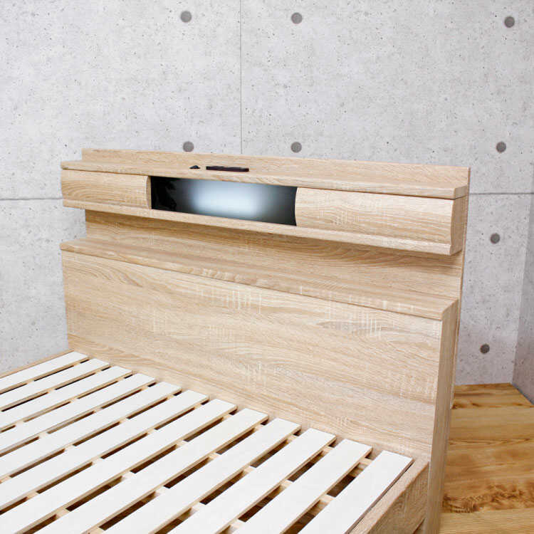 おしゃれ北欧セミダブルベッド(ナチュラル/照明ライト&2口コンセント付き/すのこ床)【販売終了】