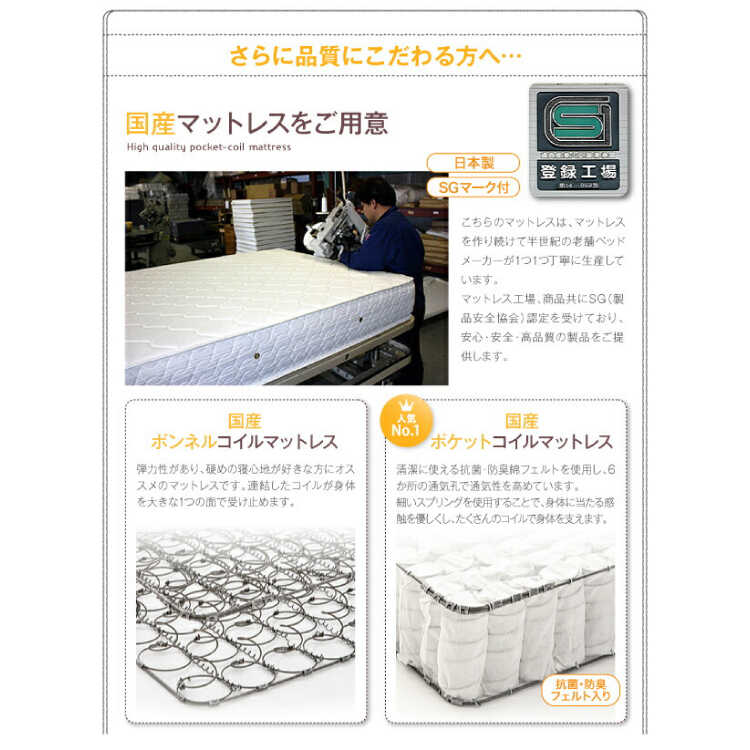 マットレスを作り続けて半世紀の老舗ベッドメーカーが一つ一つ丁寧に生産しています。マットレス工場・商品ともにSG(製品安全協会)認定を受けているため安心安全です。