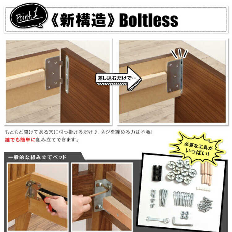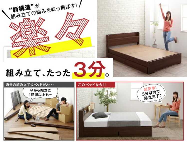 組立ては部材を差し込むだけと超簡単!一人暮らしにおすすめな収納付きセミダブルベッド。ドライバーやボルトなどの工具は必要なくたった3分で組み立てることができます。組立はもともと穴を開けてある穴に金具を引っ掛けるだけなので誰でも簡単に完成させることができます。また、引越し時などにベッドを分解する際もカチャっと部材を外すだけでなのでネジの紛失の心配もいりません。