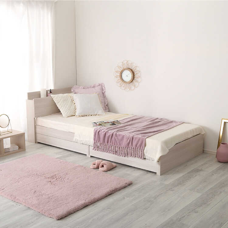 程よいシンプルさが女性に人気な大人可愛いセミダブルベッド。本物の木を使用したかのような美しい木目調プリント紙が施されています。ベッドや引き出しの内側の見えない場所にもプリント紙を使用したこだわりの仕上がり。カラーは明るいホワイトで上品さと華やかさのある印象です。過度な装飾を避けたシンプルなシルエットが魅力的。