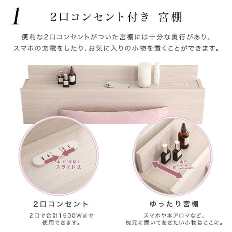 枕元にはめがねやスマホが置ける便利な宮棚を設けました。奥行13.5cmとゆったりした広さがあるので、小物を飾ってインテリアを楽しむのもおすすめです。宮棚の端の方には2口コンセントが付いており、合計1500Wまで使用できます。コンセントを使わないときは穴が閉じれるスライド式なので、ホコリの侵入を防止できて安心です。