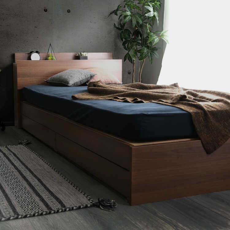 上品でかっこいいヴィンテージ風のセミダブルベッド。ウォールナット調にデザインされた美しい木目調プリント紙を使用しました。重厚感のあるブラウンな色合いがかっこよく、落ち着きのある雰囲気を演出します。ベッドや引き出しの内側まで木目調シートが使用されたこだわりの仕上がりです。シンプルなフォルムなのでスッとお部屋に馴染みます。