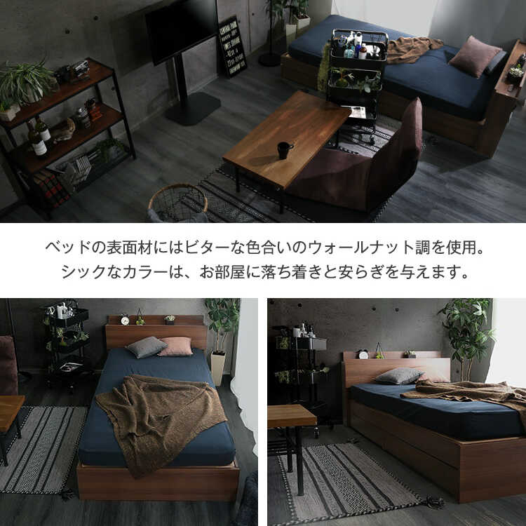 ウォールナット調のかっこいいセミダブルベッドは、ヴィンテージ風や北欧テイストにぴったりです。マットレスを敷いて立ち座りしやすい高さなので、日中はソファーのように使うのもおすすめ。別ページで同シリーズのサイズ・色違いを展開していますので是非合わせてご覧ください。(※本ページはセミダブル・ウォールナット調の販売です。)