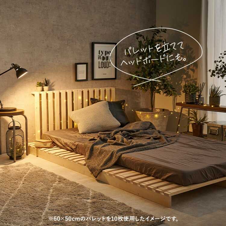 また、パレットを立ててヘッドボードにしたり、なんとパレットのみを使って置き棚を作ったり…自由な発想でベッドの領域を超えた使い方が可能です。