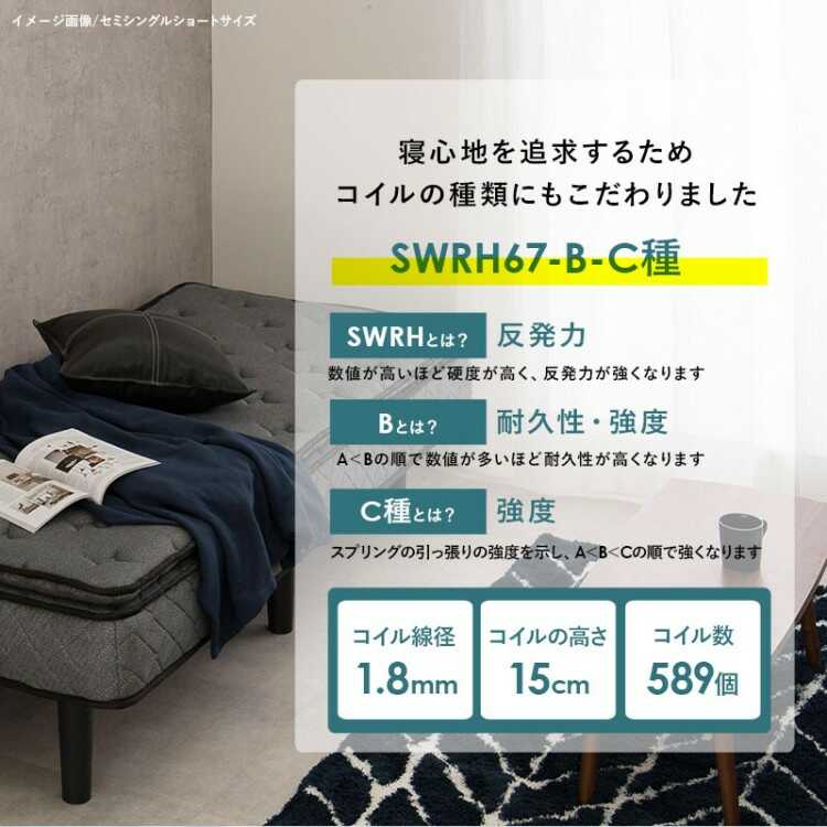 コイル数589個、コイル線経1.8mm、コイル厚み15cmのポケットコイル仕様で、反発力が高く、耐久性やスプリングの強度に優れています。