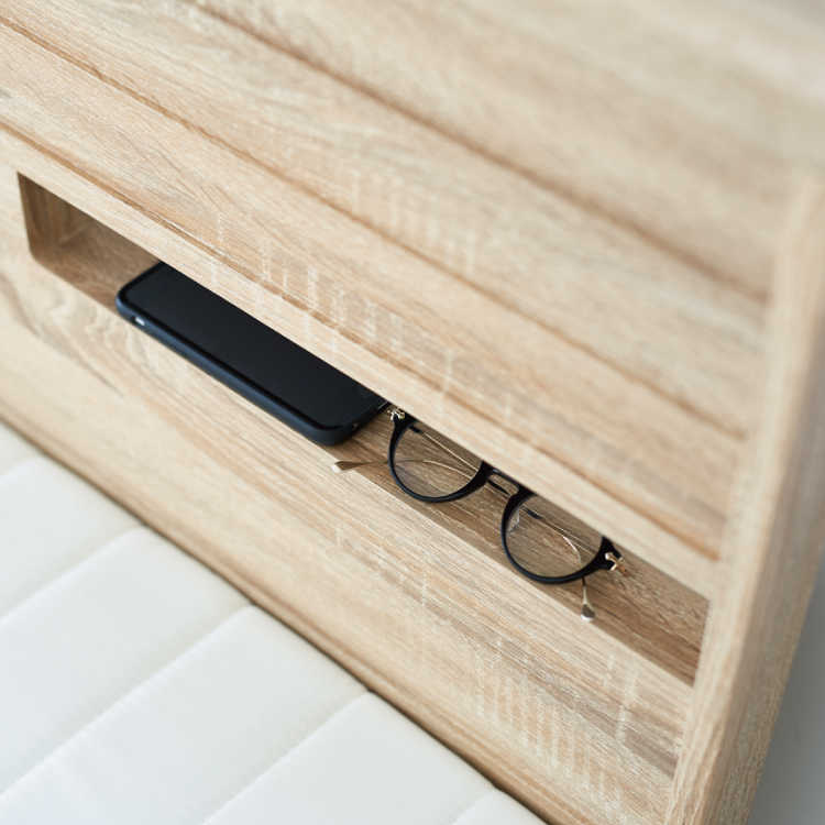 木目柄の美しいヘッドボードには、めがねやスマートフォンなどのちょっとした小物を置くことができる棚を2箇所ご用意しました。