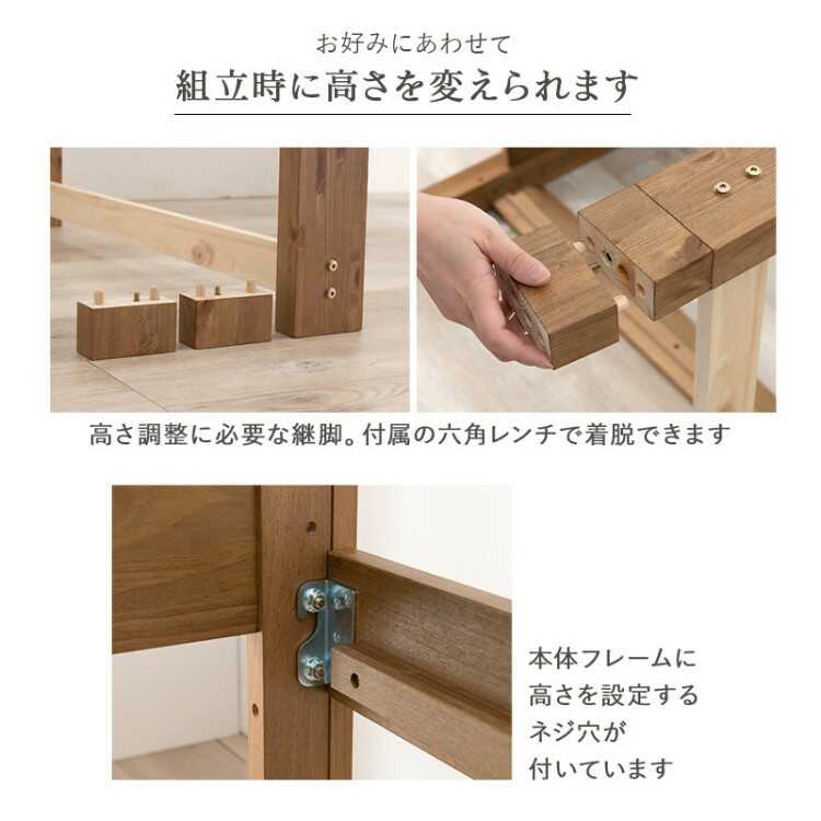 高さ調節可能・床下大量収納スペースのシングルベッド(スノコ/電源付き/天然木製/ブラウン色)