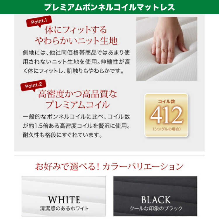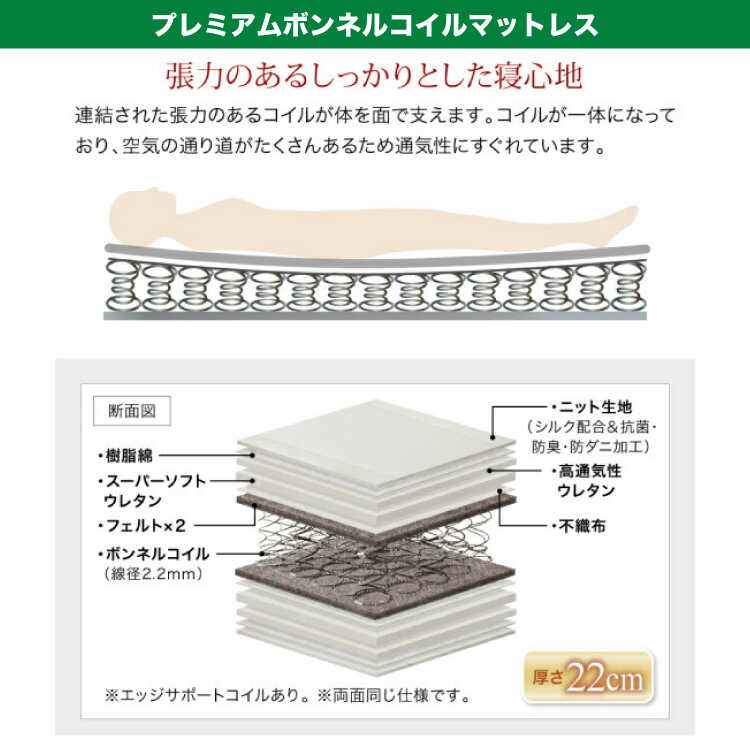一般的なボンネルコイルに比べてコイル数が約1.5倍ある高密度コイルを使用。耐久性が格段に優れています。防ダニ・抗菌・防臭加工が施されたニット生地を使用しています。