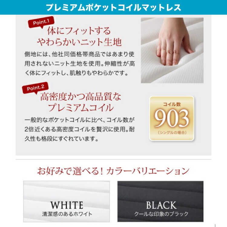 一般的なポケットコイルに比べてコイル数が2倍近くある高密度コイルを使用しており耐久性が高いです。防ダニ・抗菌・防臭加工が施されたニット生地を使用しています。