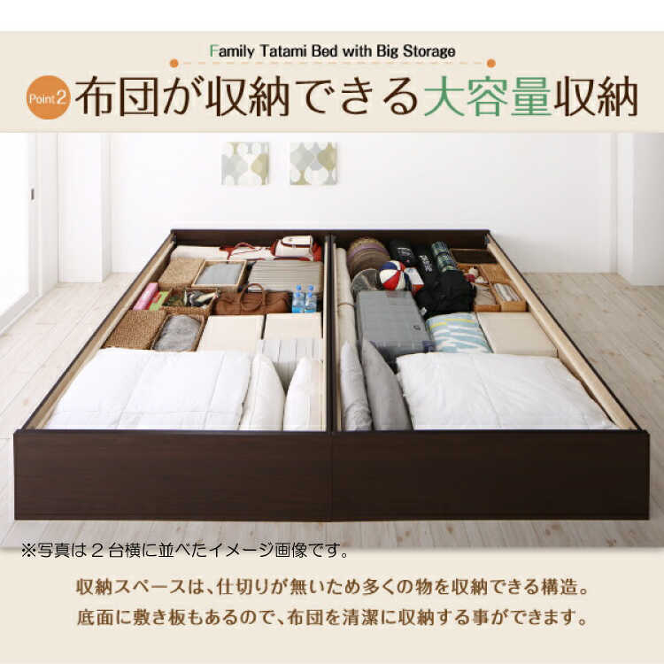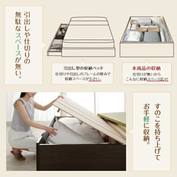 床下のすのこを持ち上げると大容量の収納スペースが出現。仕切り板がないので、引き出し付きベッドでは叶わない大物もたっぷり収納していただけます。布団はもちろん、季節物のラグなど長さのある物も収納可能です。