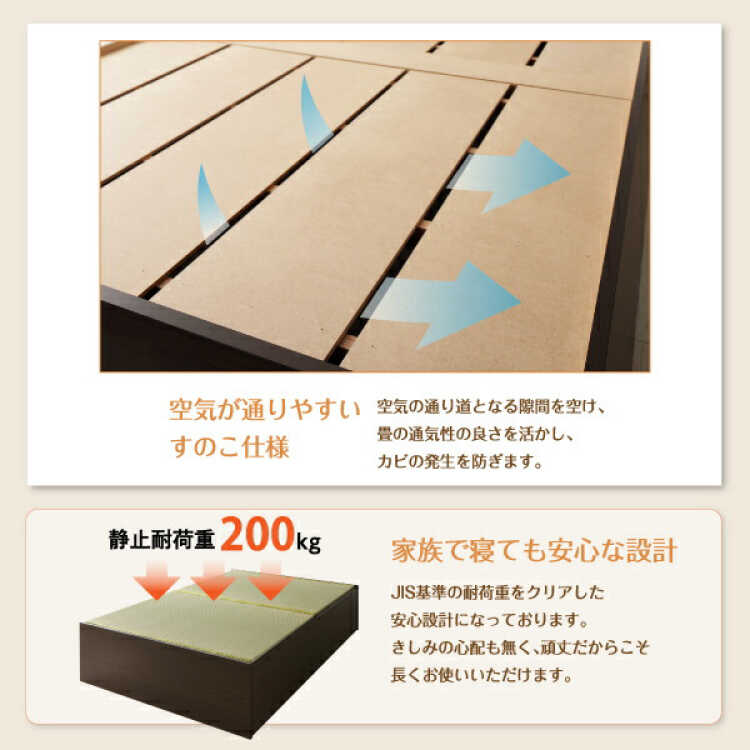 畳を支えている床板は通気性の良いすのこを採用しており、ジメジメした梅雨の季節や夏の暑い時期も爽やかな寝心地をサポートします。また、静止耐荷重は約200kgと頑丈な設計も魅力的。大人2人でも安心して使え、きしみの心配もありません。