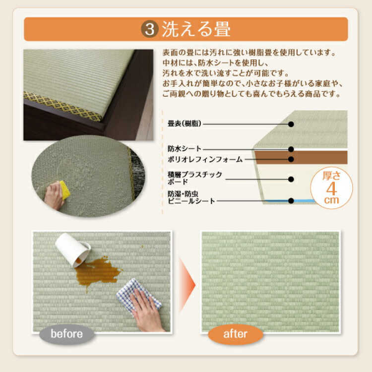 表面の畳には汚れに強い樹脂畳、中材に防水シートを使用しているため、うっかり飲み物をこぼしてしまっても水で洗い流すことができます。お手入れが簡単なので、お子様のいるご家庭でも安心です。