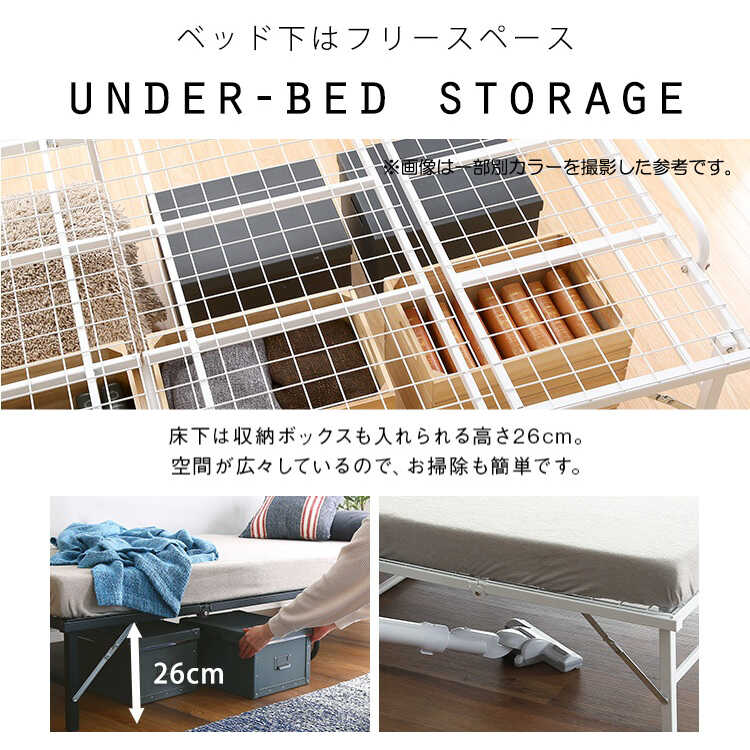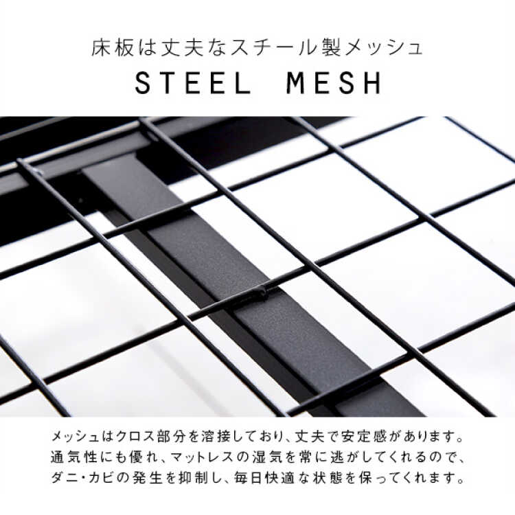 床板は通気性が良く丈夫なスチール製メッシュを使用しました。湿気がこもりにくいのでダニやカビの発生を抑制し、快適な睡眠環境をキープしてくれます。クロスになっている部分は溶接することによって安定感を強化しました。床下は高さ26cmの広さがあり、ボックスを使った収納に便利です。空間が広々しているので、掃除機も使いやすくラクラクです。