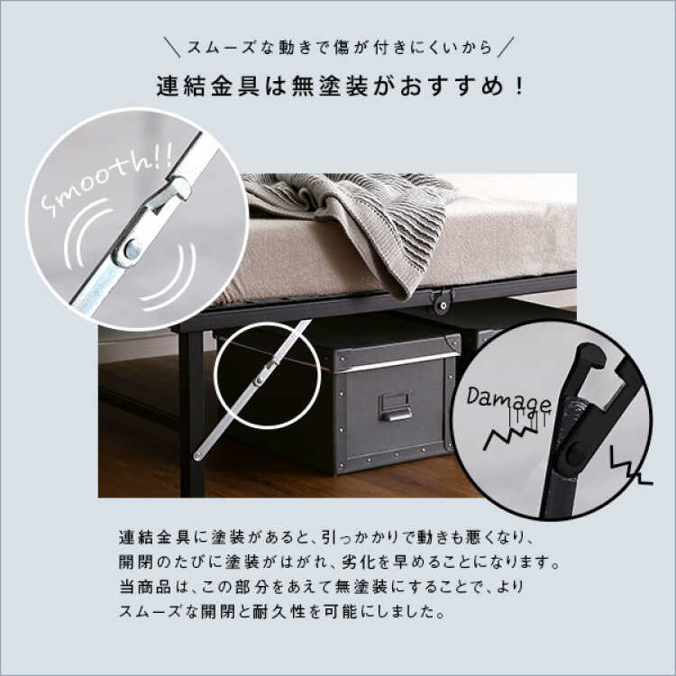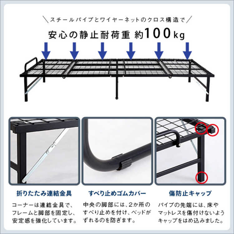 素材に頑丈なスチールを使用した耐久性の高い仕上がりで、長くご愛用いただけます。約100kgの静止耐荷重を備えているので大柄な方でも安心です。さらに、折りたたみの連結金具でフレームと脚部を固定し、安定感も強化しました。中央の脚部は2箇所に滑り止めが付いているのでベッドが不用意にずれるのを防ぎます。パイプの先端には傷防止キャップをはめ込んでいます。