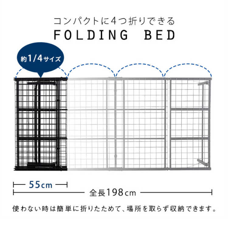 4つに折りたたみできるシングルベッド。折りたたみ時は幅55cm×奥行17.5cm×高さ95cmとコンパクトになるので、場所を取らずに収納できます。誰でも簡単に折りたためて複雑な作業が要らないので安心です。広げたら大人一人でゆったりくつろげるシングルサイズになります。一人暮らしを始める方やお引越しが多い方など、様々な人におすすめです。