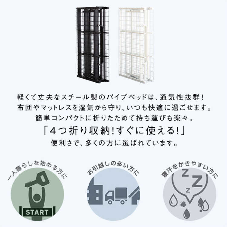 仕様補足 折りたたみ式、静止耐荷重約100kg 注意事項 ※本ページはシングルベッド(ブラック)の販売です。小物等は付属しません。