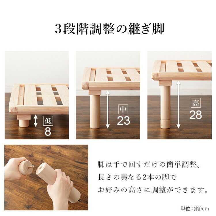 サイズ 幅102cm、奥行210cm、高さ12.5cm/27.5cm/32.5cm(3段階調節可能) 材質 天然ひのき 構造仕様 お客様で組み立てていただく商品です