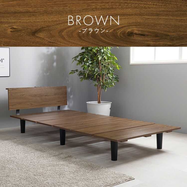 木目ブラウンのパネル板を並べ、アクセントに黒の脚をプラスした、シンプル&スタイリッシュなシングルベッド。