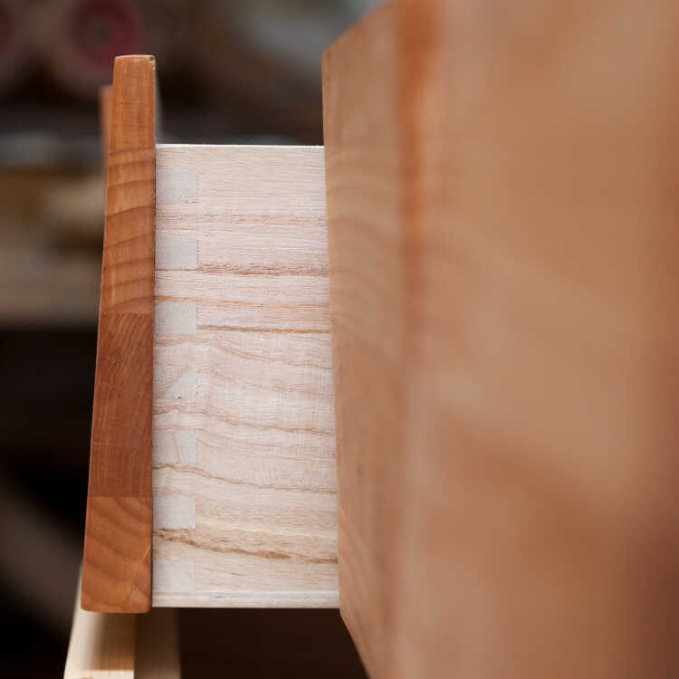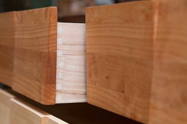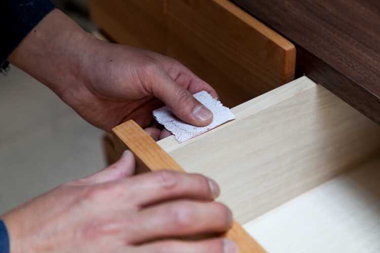 ホワイトオーク製衣装チェストの引出し内部は強度を高めた箱組、さらに大切な衣類を湿気やホコリ等から保護する擦り込みが施されており、一般的なチェストと比べると細部までこだわりつくされたグレードの高い仕上がりです。