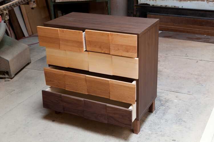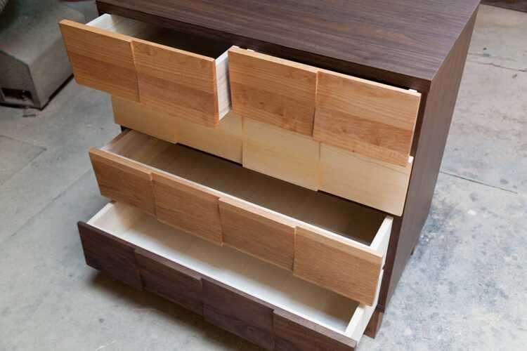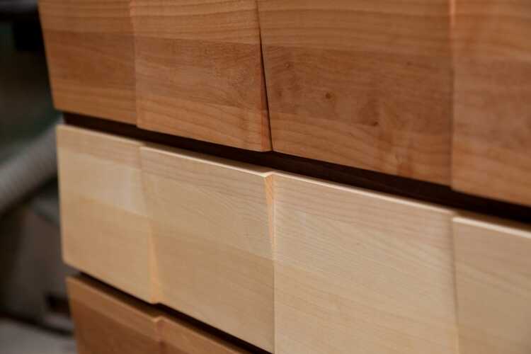 引出し前板は斜めにカットされたデザインで、立体感のある仕上がり。