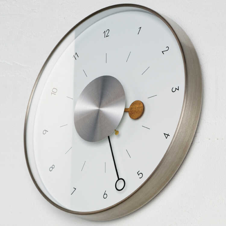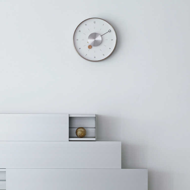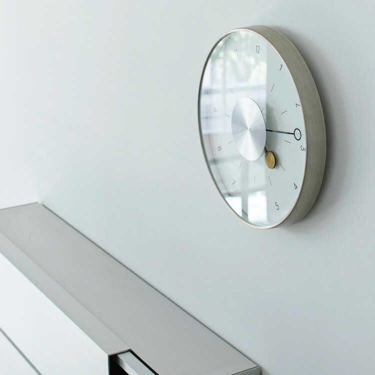 無機質な都会的でクールな印象の中に絶妙なバランスの異素材のアクセントを加えた壁掛け時計。